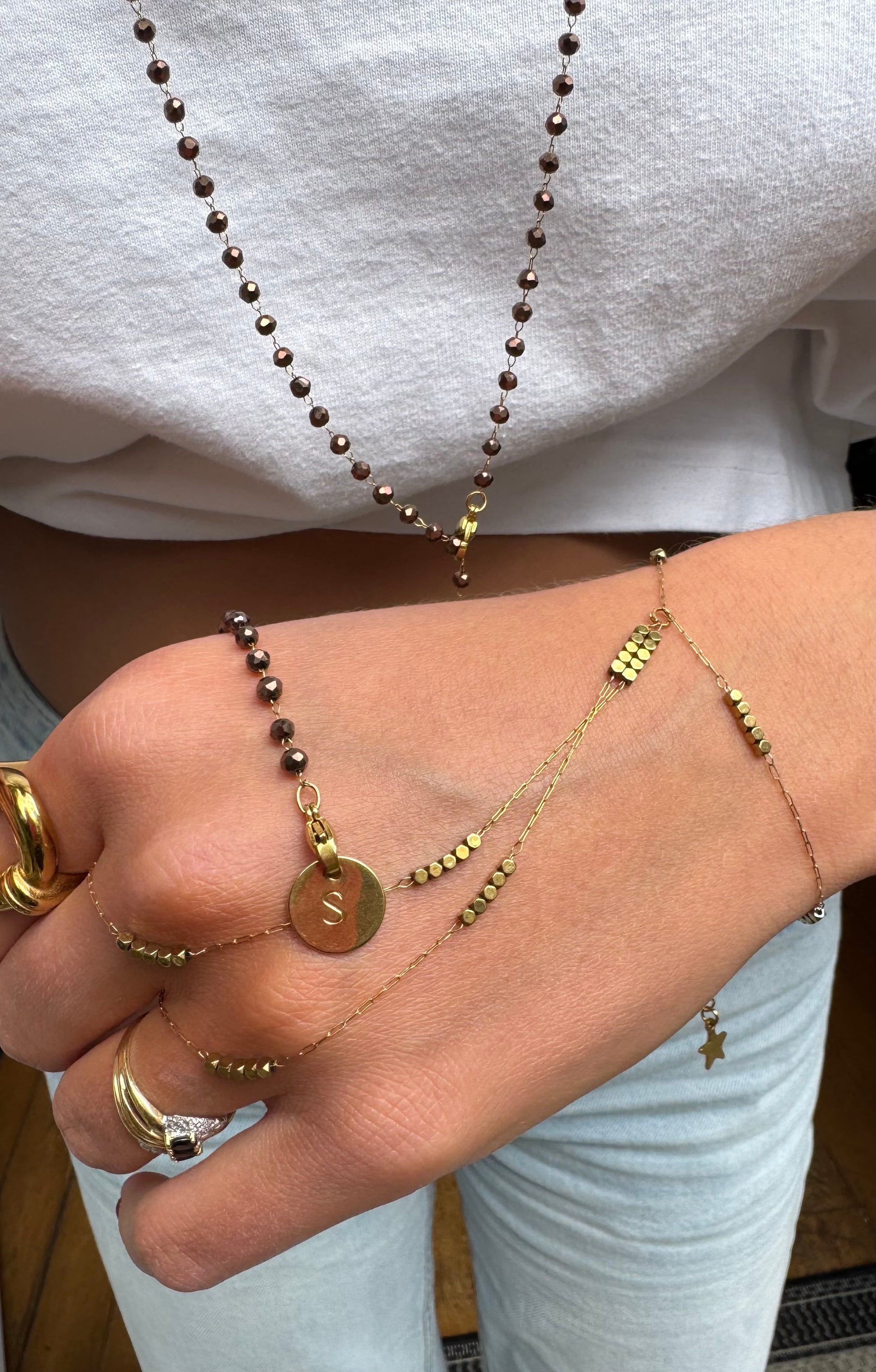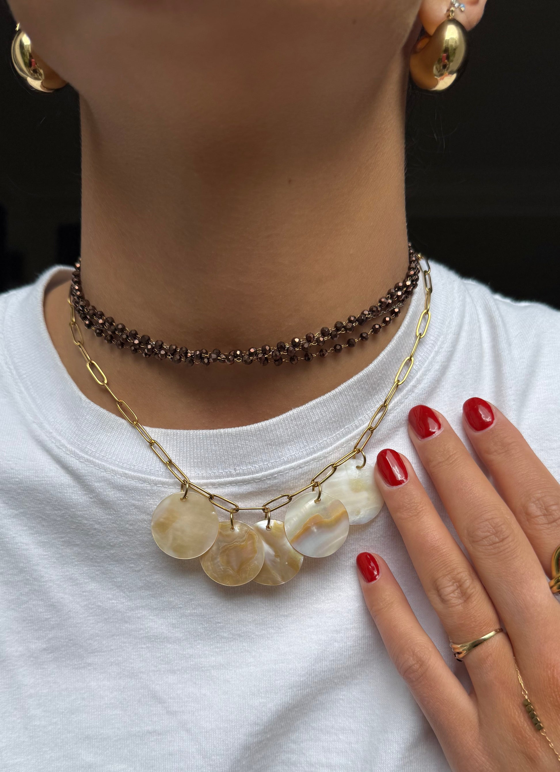 Le bijou « brown » peut se porter de différentes façons grâce à ses deux fermoirs aux extrémités, en sautoir, en collier, en bracelet, en chaîne de ventre ou en encore en ras de cou.