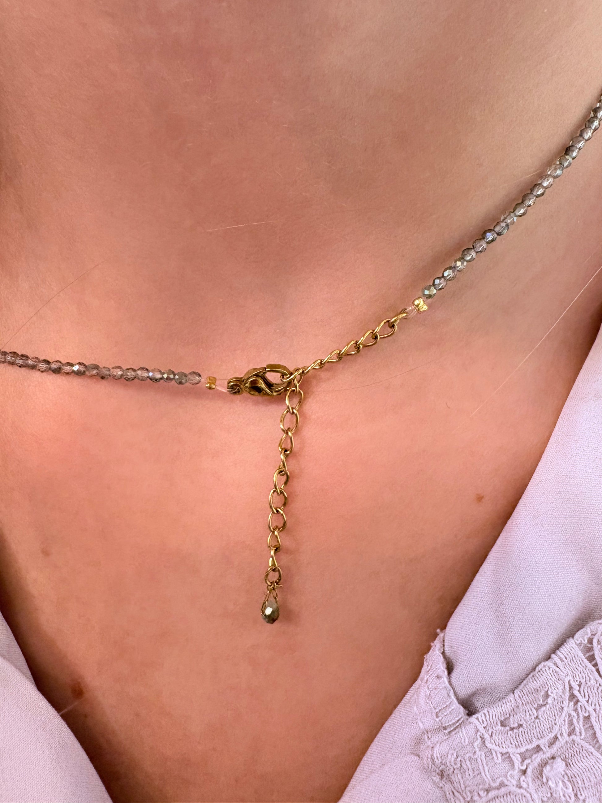Le collier est fait de perles en verre et finitions dorées en acier inoxydable, sa taille est ajustable.