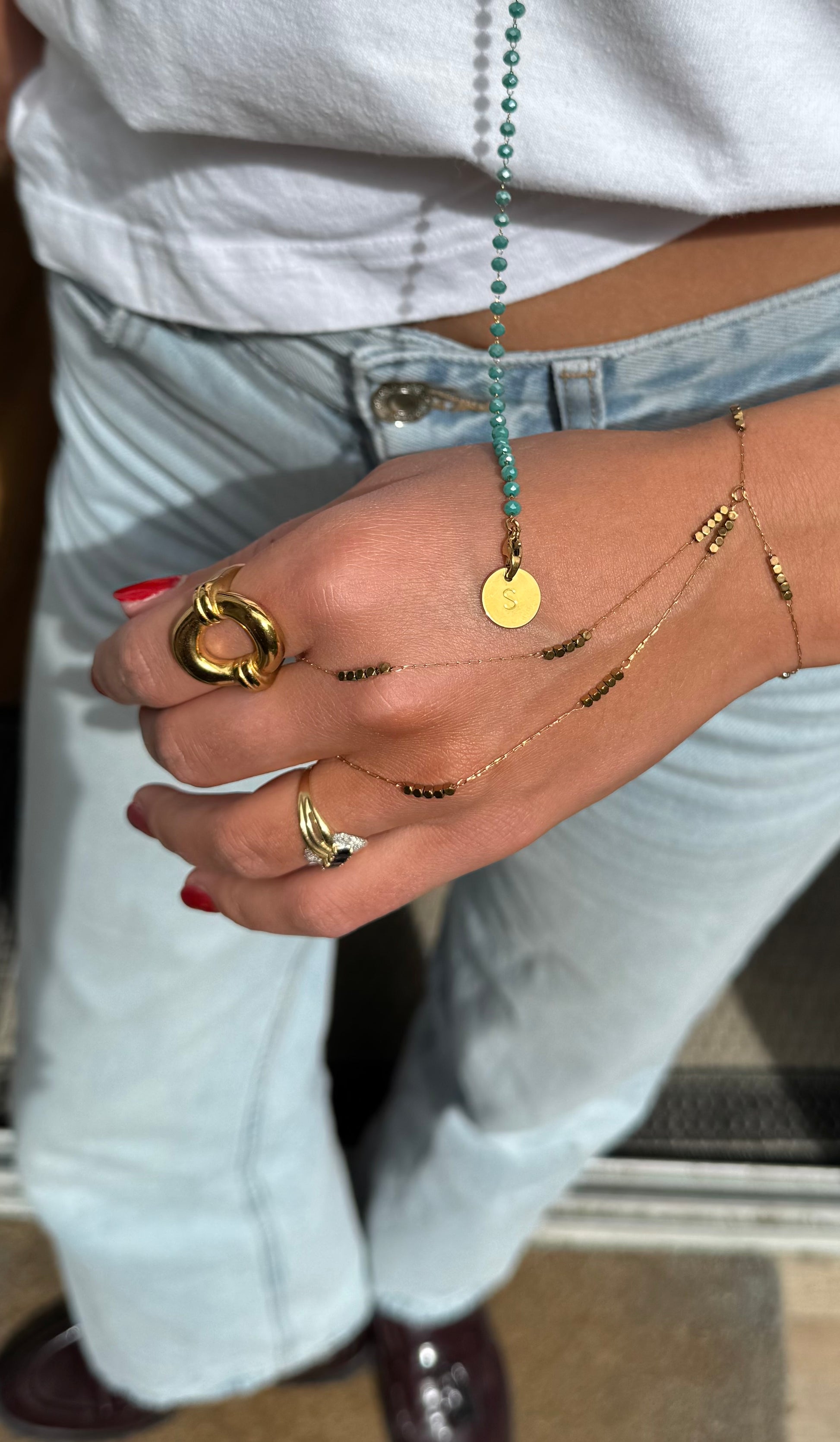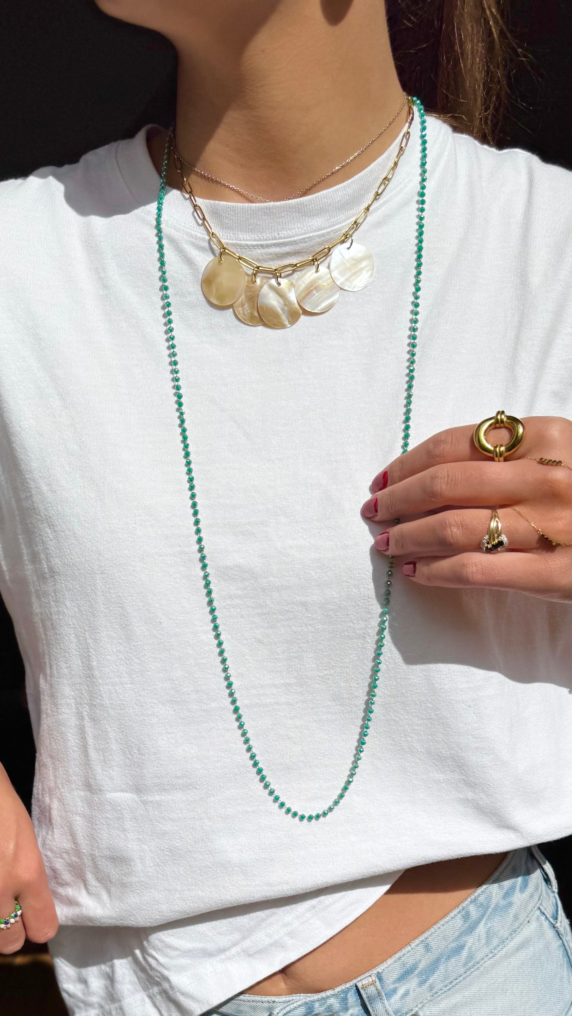 Le bijou « turquoise » peut se porter de différentes façons grâce à ses deux fermoirs aux extrémités, en sautoir, en collier, en bracelet, en chaîne de ventre ou en encore en ras de cou.