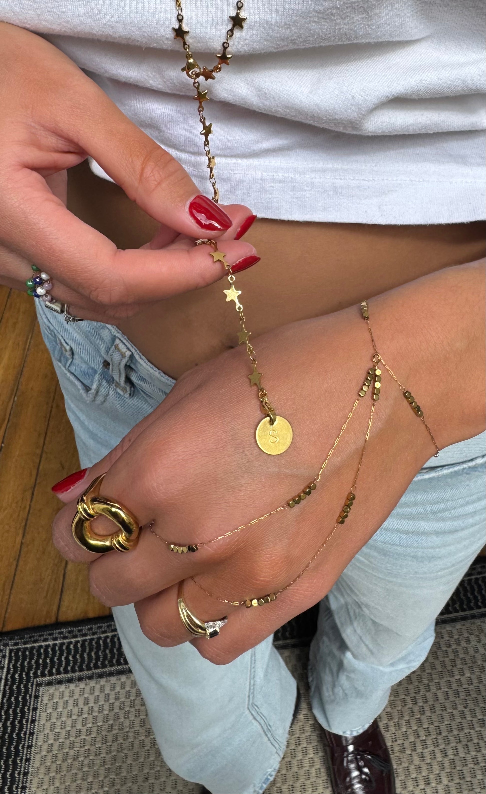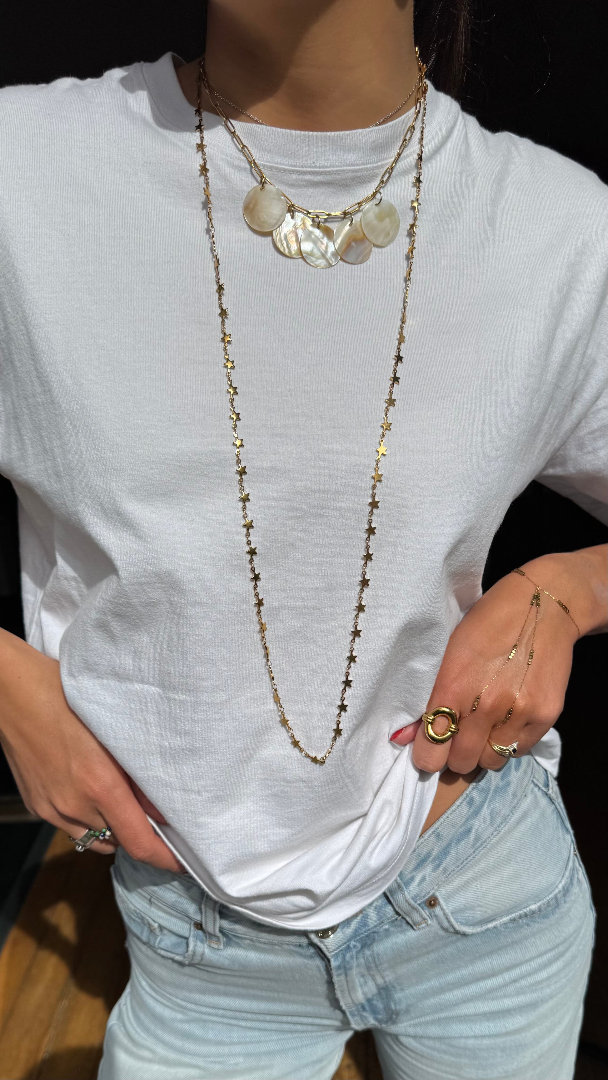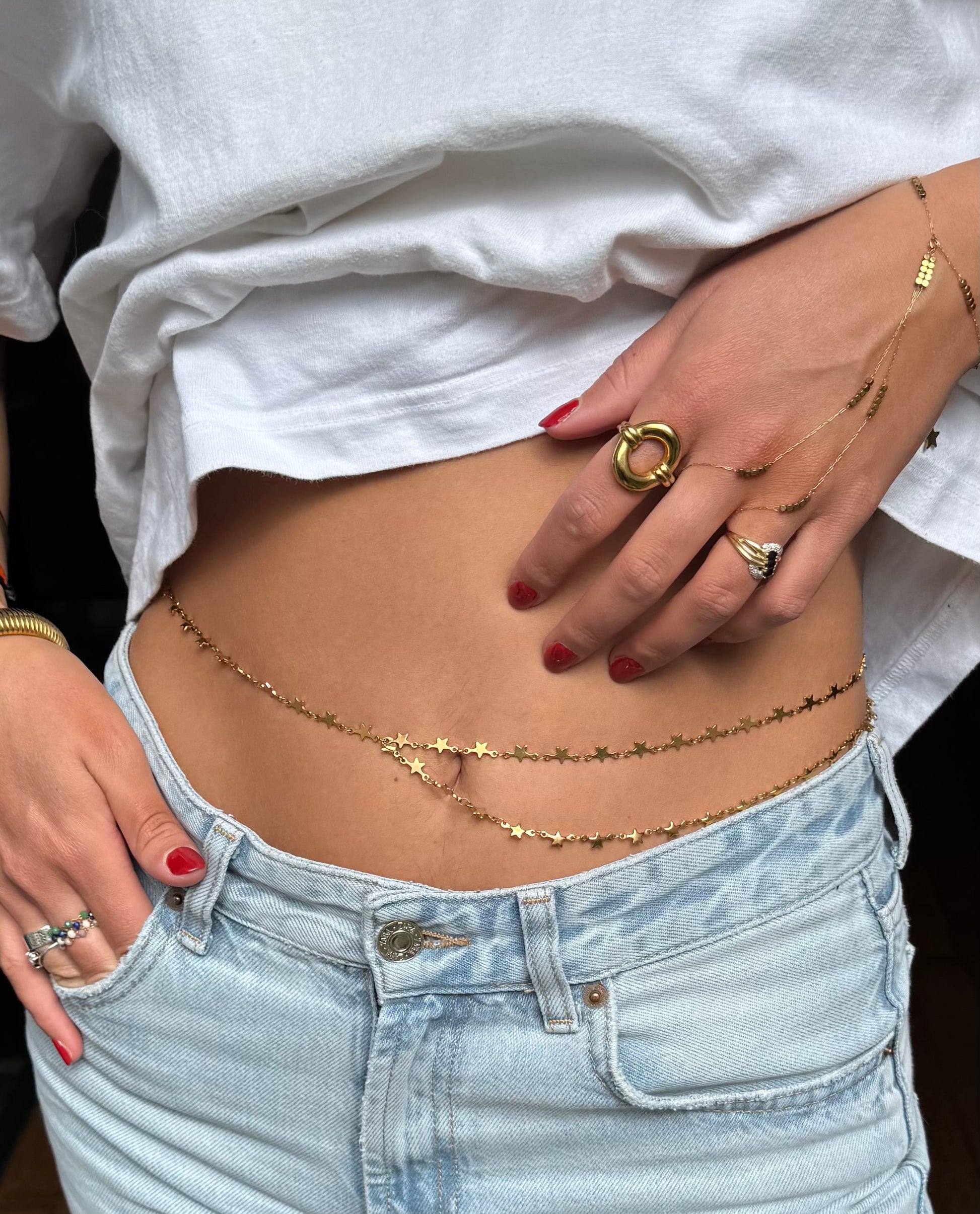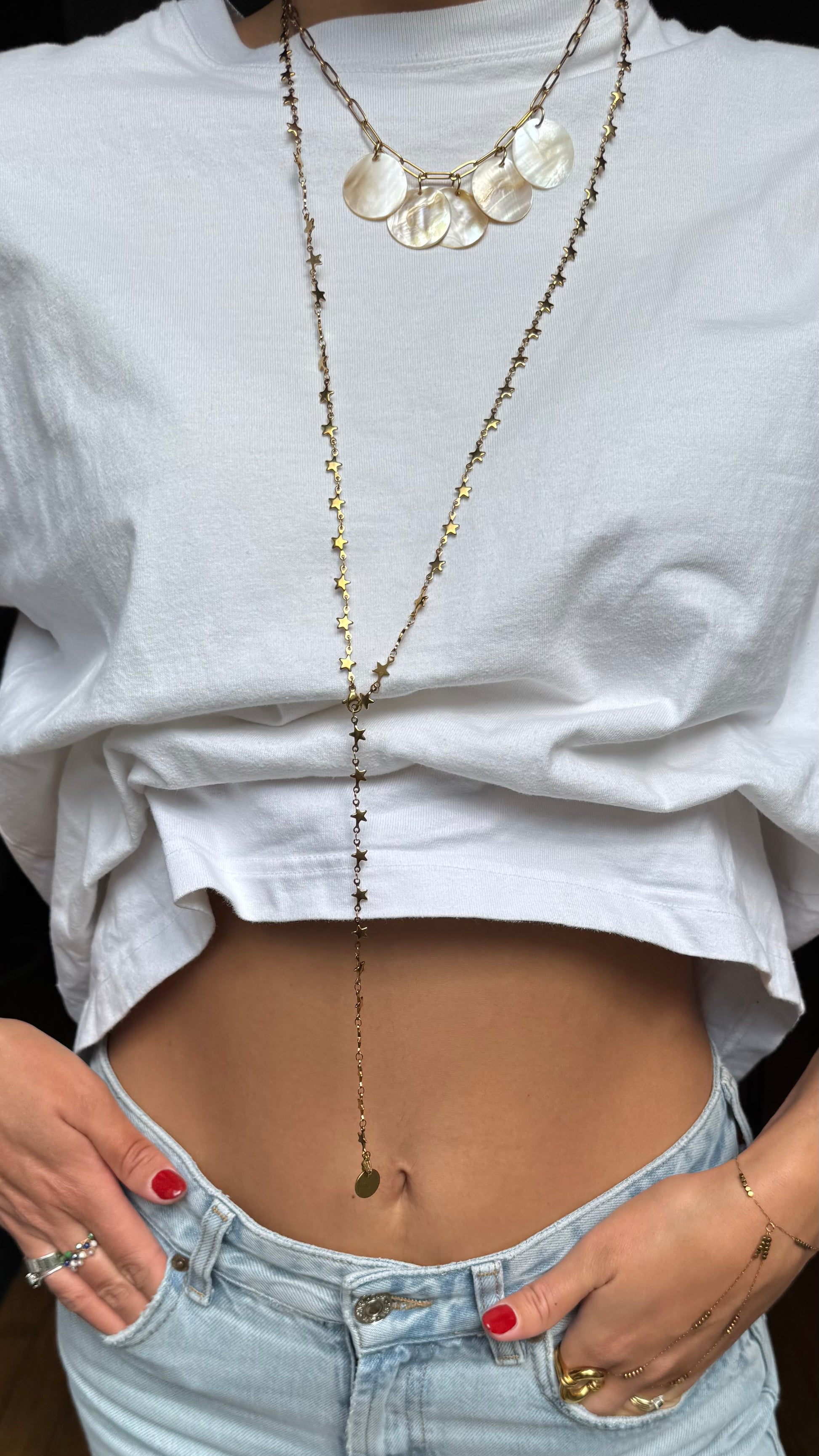 Le collier « l’étoile » peut se porter de différentes façons grâce à ses deux fermoirs aux extrémités, en sautoir, en collier, en bracelet, en chaîne de ventre ou en encore en ras de cou.